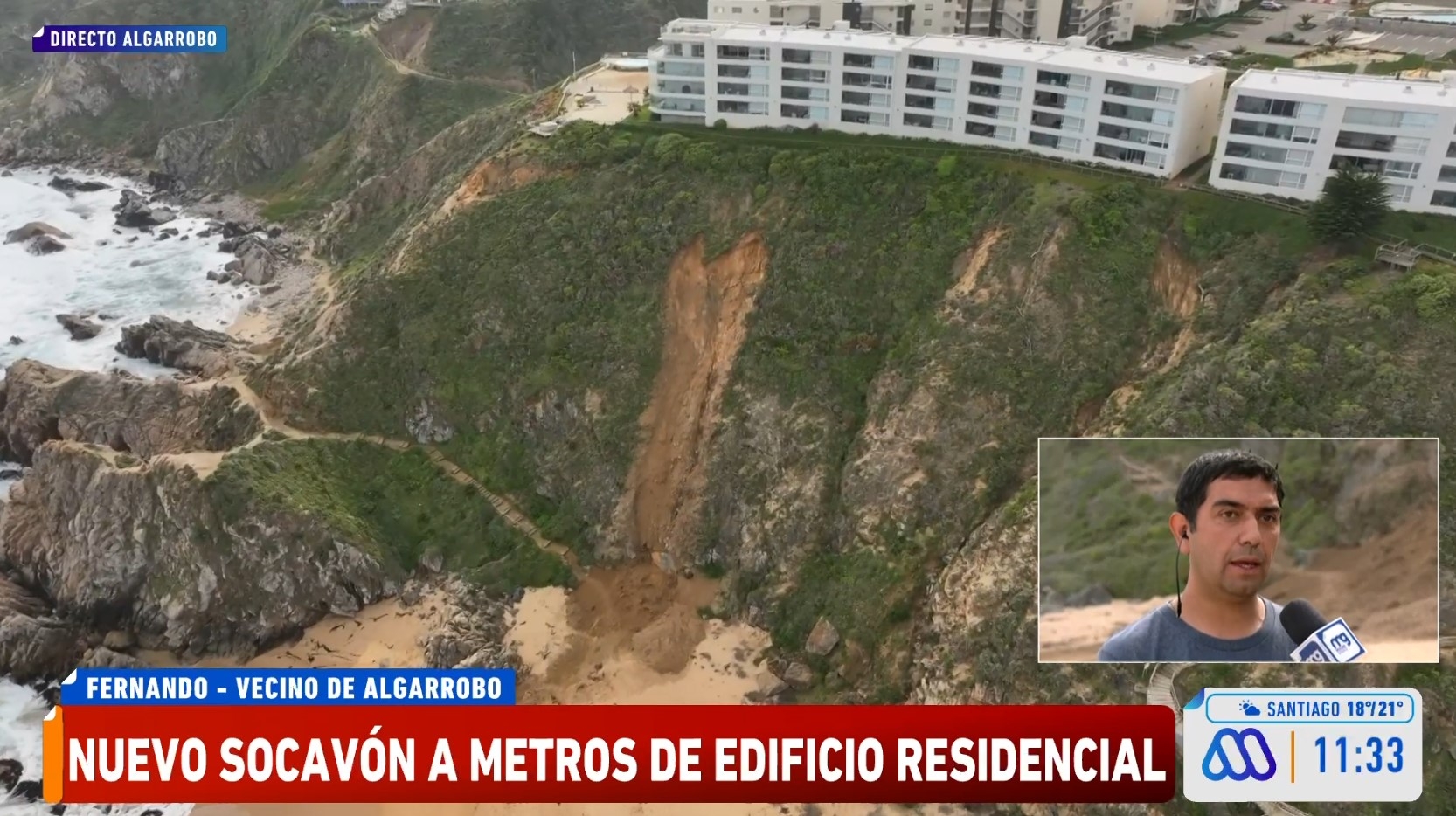 Fernando, vecino de Algarrobo, indicó que las últimas lluvias registradas en la zona provocaron el deslizamiento de tierra, el cual, a su juicio, estaría asociado justamente al levantamiento de departamentos en el borde de la ladera.