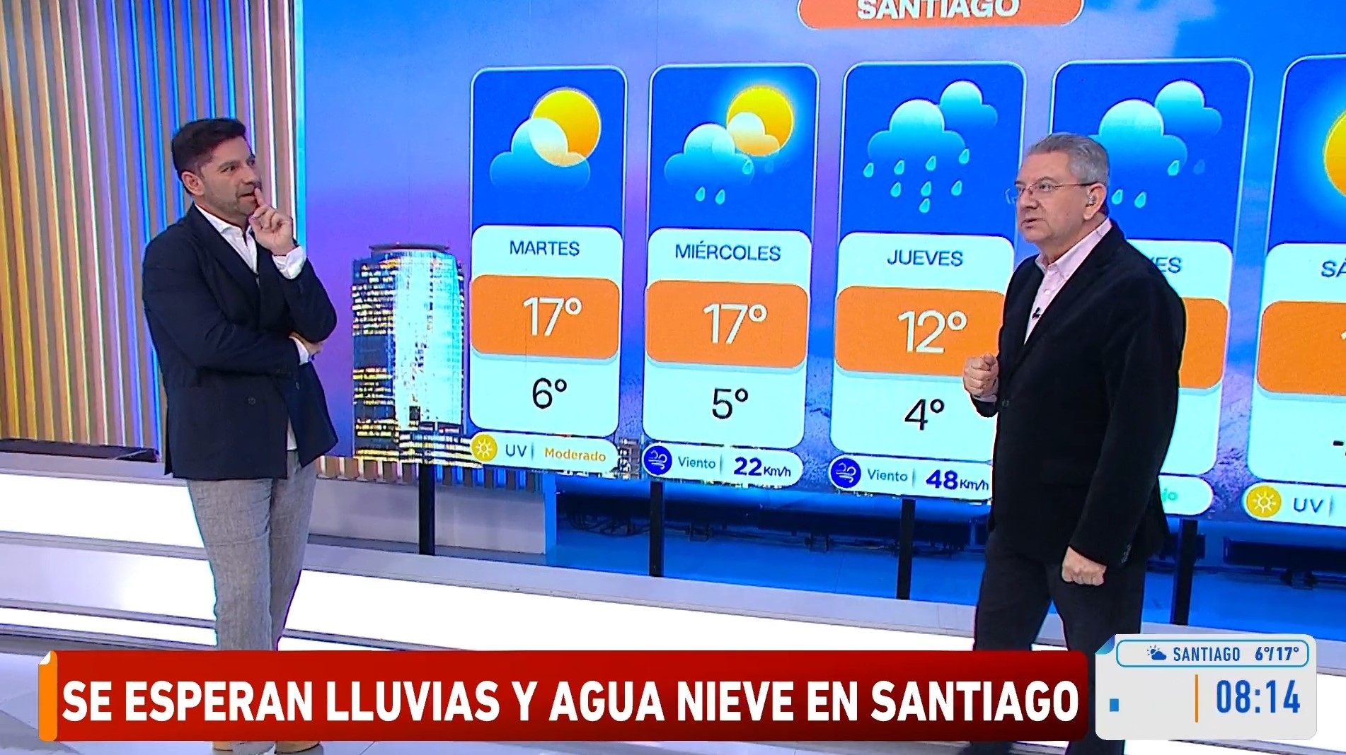 Según lo informado por el meteorólogo de Mega, Jaime Leyton, en Mucho Gusto, se espera que las precipitaciones regresen en las últimas horas del día miércoles, a eso de las 21 horas en las comunas del sector sur oriente y oriente.
