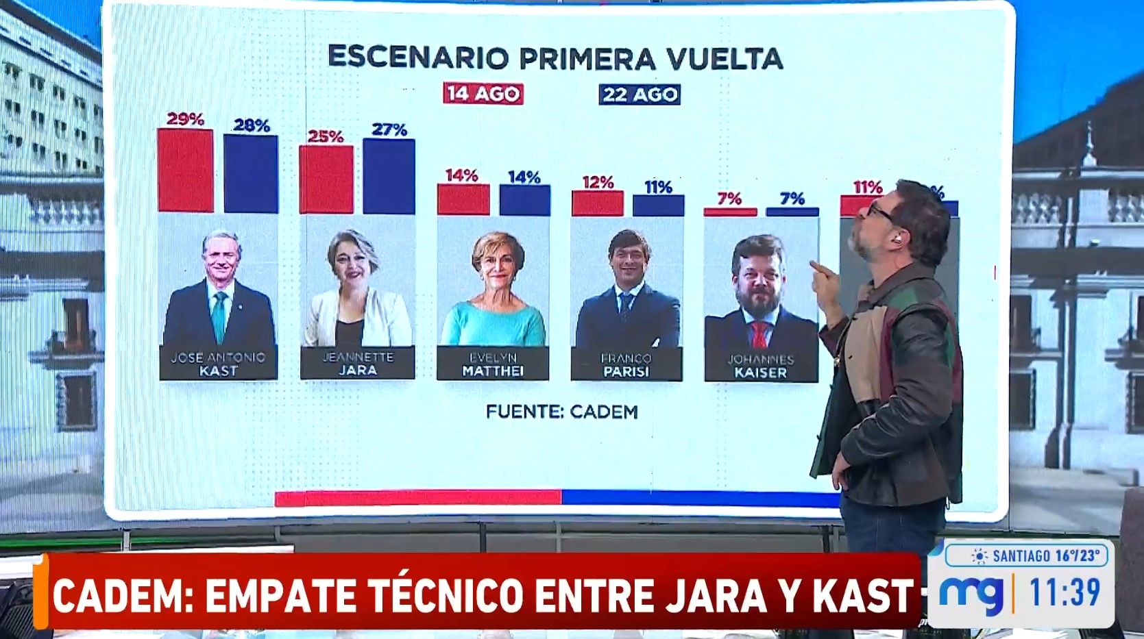 En una nueva edición de la encuesta Plaza Pública de Cadem, correspondiente a la cuarta semana de agosto, se proyectó un empate técnico entre Jeannette Jara (PC) y José Antonio Kast (Republicanos).