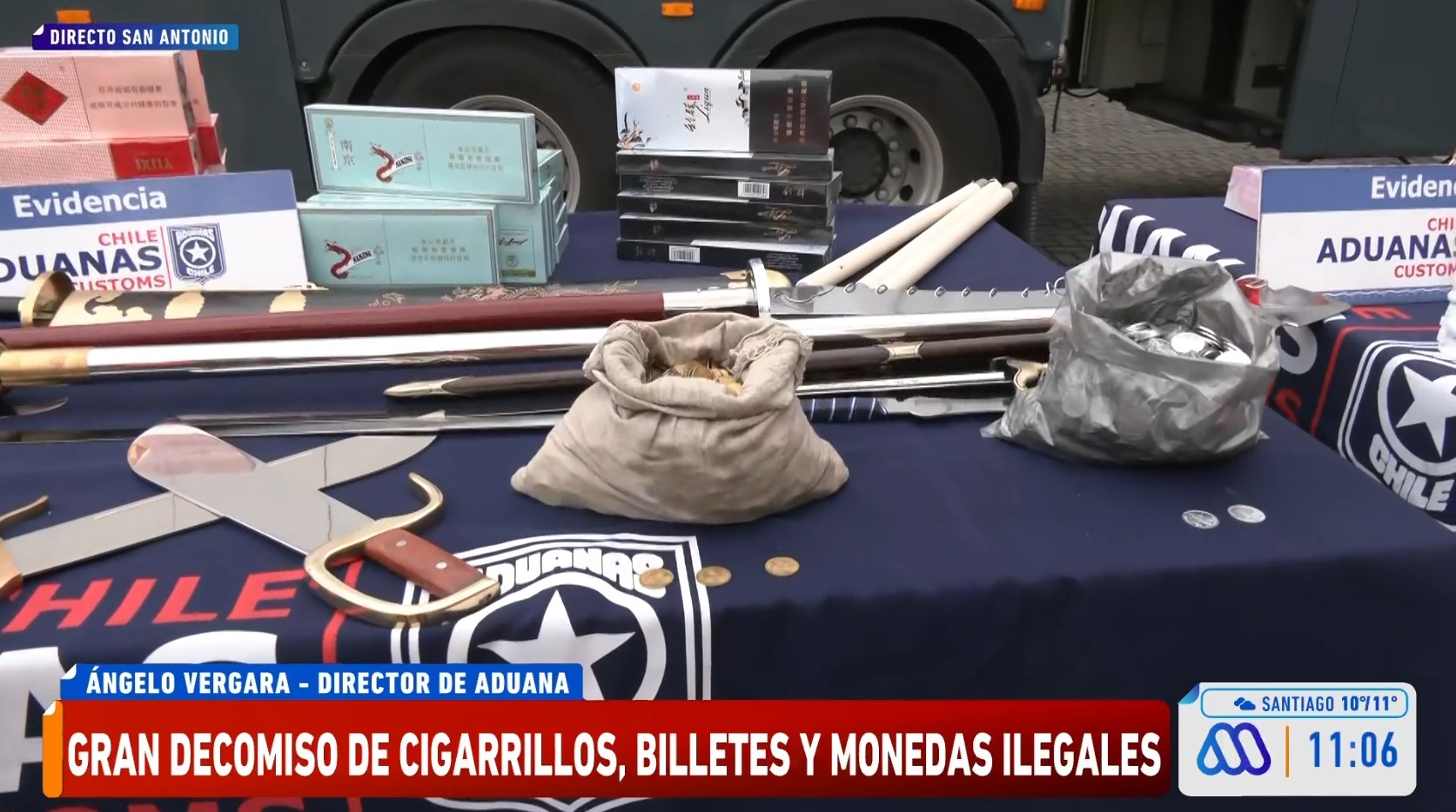 Fiscalizadores del Servicio Nacional de Aduanas de San Antonio lograron incautar un cargamento de katanas, armas blancas, cigarrillos ilegales y más de 355 mil monedas chilenas y billetes argentinos.