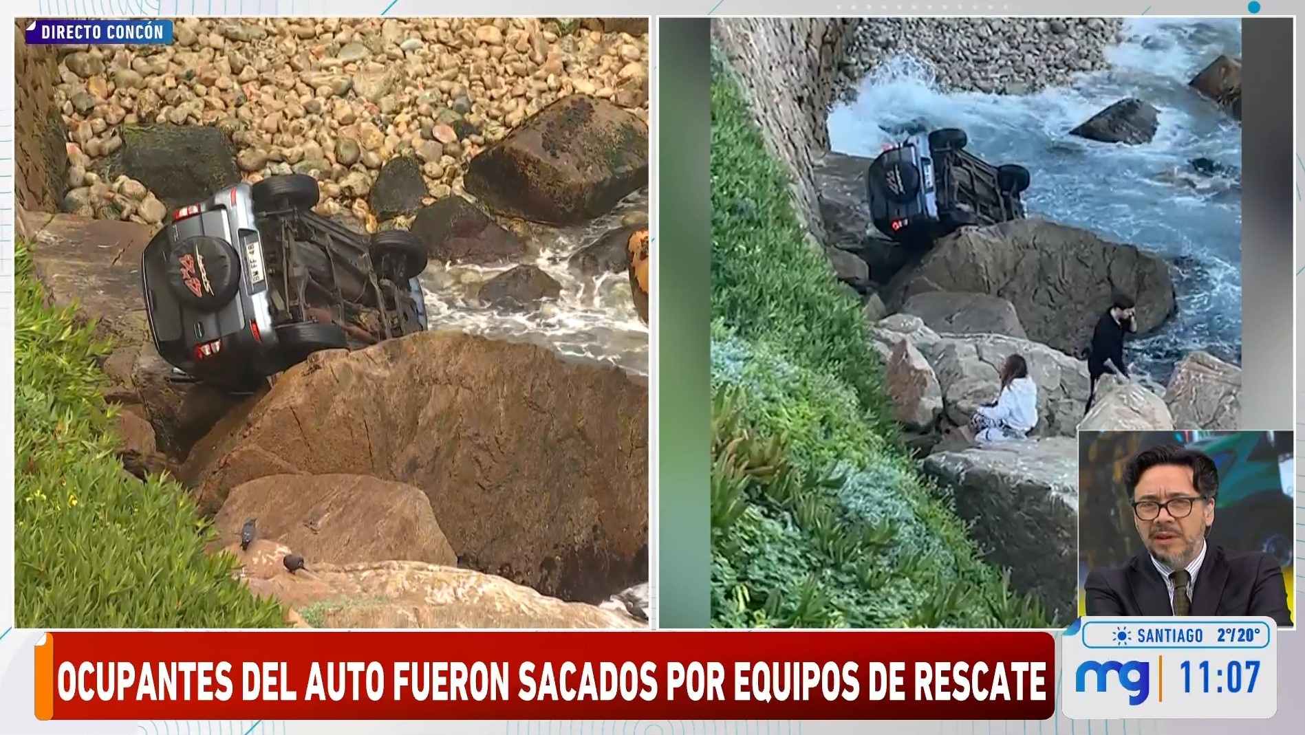 Al interior del automóvil se encontraban dos personas, una madre con su hijo que debieron ser rescatados por los equipos de emergencia tras quedar a centímetros del mar en cercanías de la Roca Oceánica.