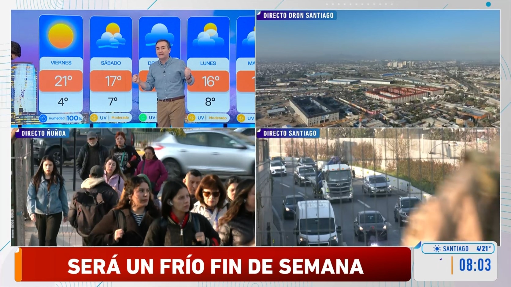 "En la tarde en las comunas del sector oriente: Lo Barnechea, Las Condes, La Reina, Peñalolén, La Florida, Puente Alto. En algunas de esas comunas caen algunos goterones el domingo en la tarde", detalló, agregando que todo esto ocurrirá en un contexto frío, con solo 12 grados de máxima.