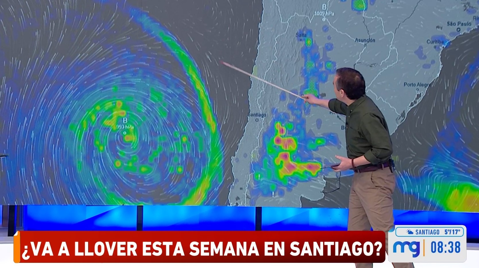 En su intervención en Mucho Gusto, Sepúlveda mostró una proyección del mapa meteorológico de Chile, donde indicó que un sistema frontal se encuentra en cercanías de la costa nacional y que le ganaría la pulseada a la alta presión.