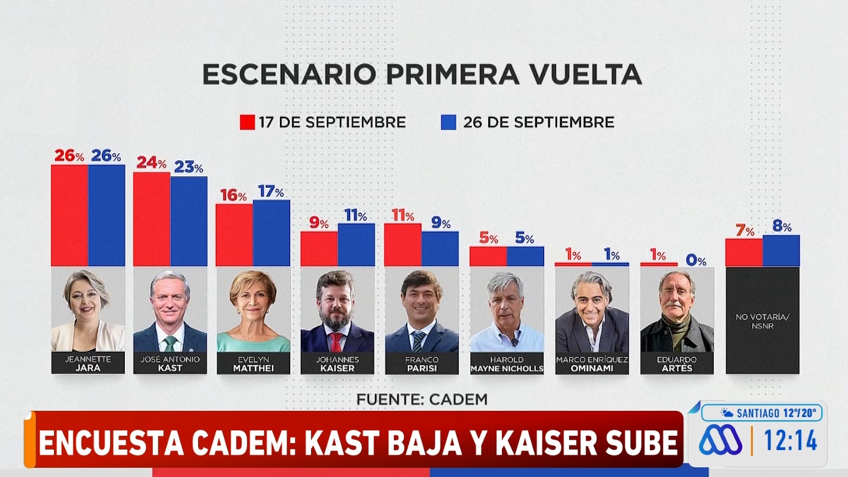 De acuerdo al sondeo, la candidata oficialista, Jeannette Jara, se mantiene liderando con un 26% de las preferencias en una eventual primera vuelta, seguida por José Antonio Kast que sufrió una baja de un punto porcentual, posicionándose en 23%.