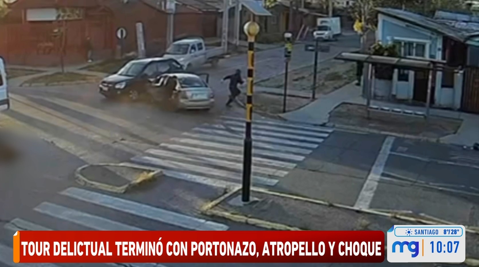 Los ladrones huyeron a toda velocidad en el auto en que ya venían, subiendo a veredas y esquivando peligrosamente a furgones escolares, así hasta que llegaron a la intersección de Zapadores con Avenida Los Zapadores, donde arrollaron a un motociclista y colisionaron con un auto de color negro.