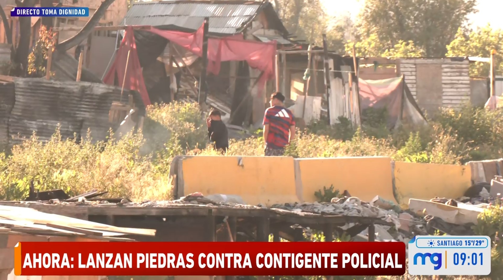 La cámara de Mucho Gusto registró un tenso momento en el cual sujetos comenzaron a lanzar piedras a personal de Carabineros mientras realizaba el desalojo de la toma Dignidad, ubicada en La Florida, Región Metropolitana.