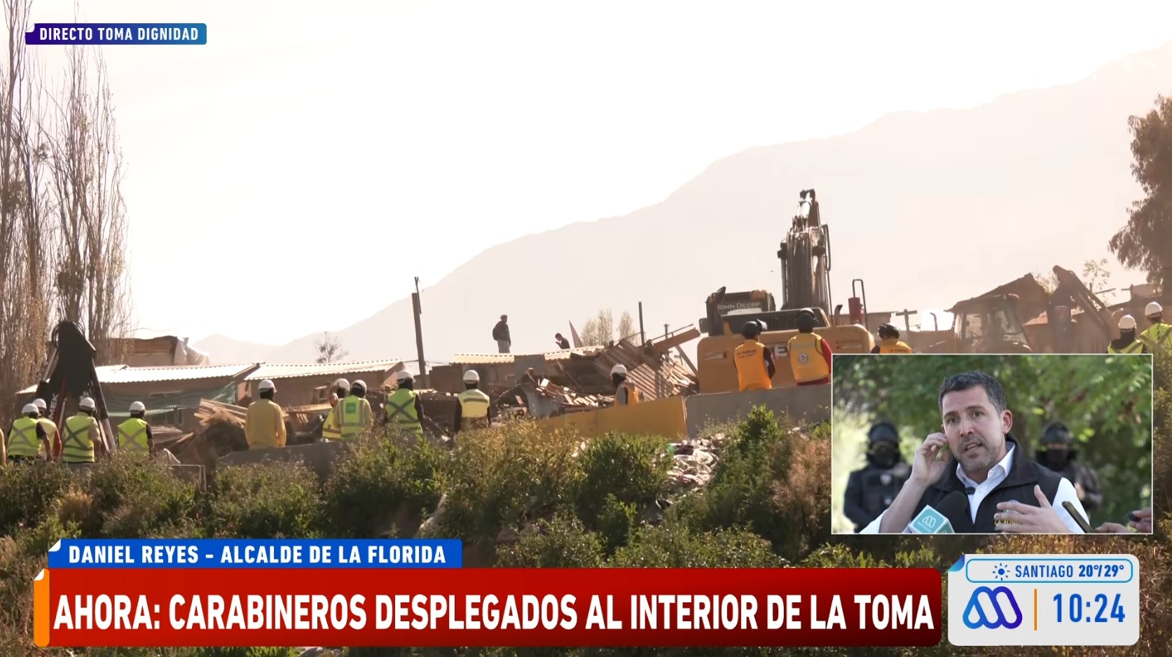 El alcalde de La Florida, Daniel Reyes, abordó el operativo de desalojo de la toma Dignidad, donde se registró un gran despliegue policial con alrededor de 300 carabineros para el retiro de 194 familias.