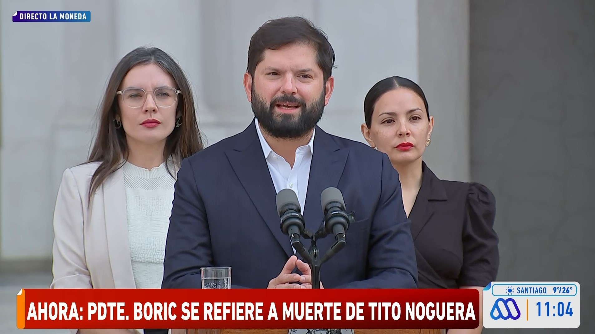 En un punto de prensa desde el Palacio de La Moneda, el mandatario partió señalando que "ha partido Héctor "Tito" Noguera, un gigante de Chile, un gigante del teatro, un gigante de la cultura que deja un legado imperecedero a través de su trayectoria en las tablas, en el cine, en su familia por cierto, y en todos quienes tuvimos la oportunidad de conocerlo".