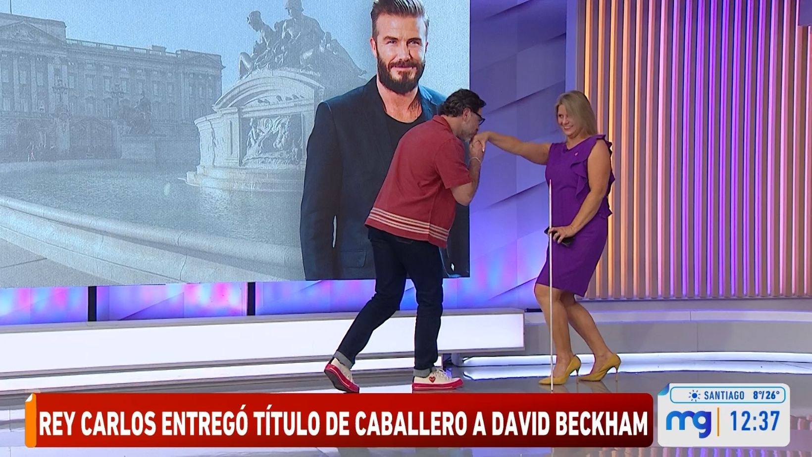 Después de hablar sobre la actualidad del entorno del rey Carlos III, José Antonio tuvo la brillante idea de pedirle a la "Gringa" que recrearan la ceremonia de Beckham. Siguiendo el juego, Marianne tomó la vara que suelen utilizar Alejandro Sepúlveda y Jaime Leyton para dar el pronóstico del tiempo, mientras Neme se arrodillaba frente a ella.