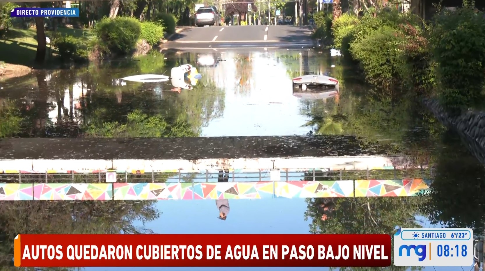 Dos vehículos quedaron atrapados bajo el agua durante la madrugada de este viernes, luego del anegamiento del paso bajo nivel de la Villa Frei en la comuna de Ñuñoa, Región Metropolitana.