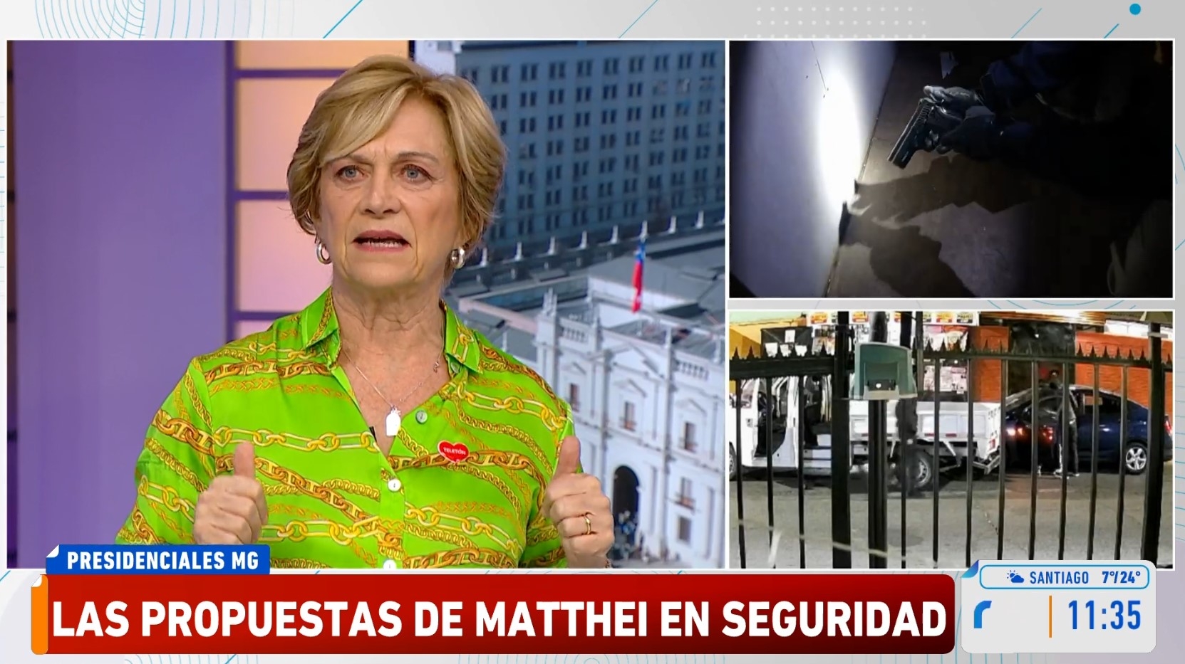 La candidata presidencial de Chile Vamos, Evelyn Matthei, habló en extenso con Mucho Gusto sobre sus propuestas para combatir la crisis de seguridad que afecta al país, además de la migración irregular. Las medidas van desde la instalación de cámaras, drones, inteligencia artificial, hasta realizar redadas como en Estados Unidos y enviar criminales a El Salvador.