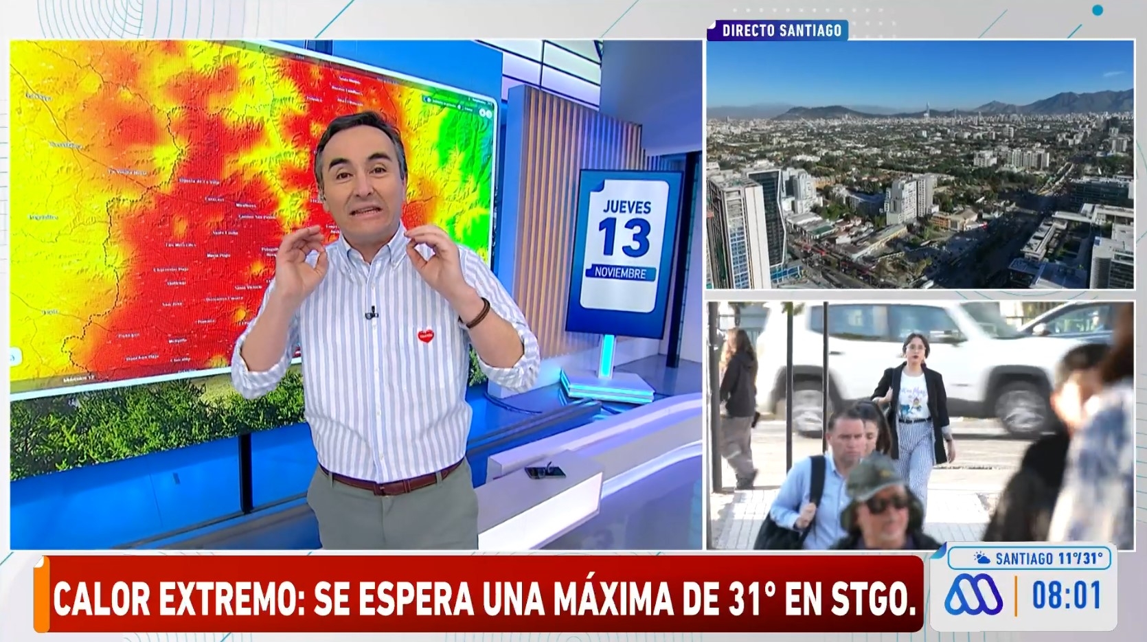 El periodista especializado en meteorología de Mega, Alejandro Sepúlveda, entregó su pronóstico del tiempo para este jueves 13 de noviembre, donde la Región Metropolitana será epicentro de las altas temperaturas.