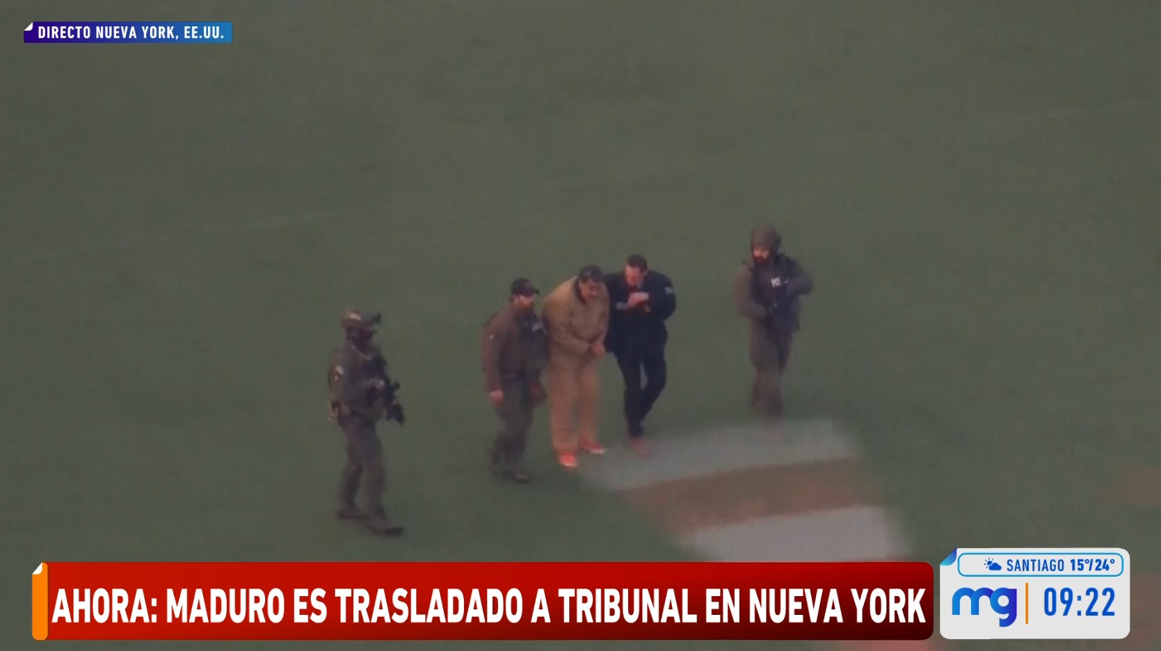 En las imágenes captadas es posible ver a Maduro esposado, vistiendo una chaqueta y pantalón de color café, rodeado de un gran contingente policial y militar estadounidense.