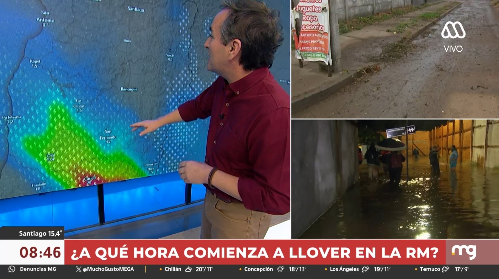 "A esta hora, las precipitaciones están básicamente centradas en la parte norte de la región del Maule, ahí en la provincia de Curicó", destacó en Mucho Gusto, indicando que, en la medida que avanza este día, se va a quedar el sistema frontal estacionado en la zona norte de O'Higgins, es decir, en las provincias de Cardenal Caro y Colchagua, con la probabilidad de tormentas eléctricas.