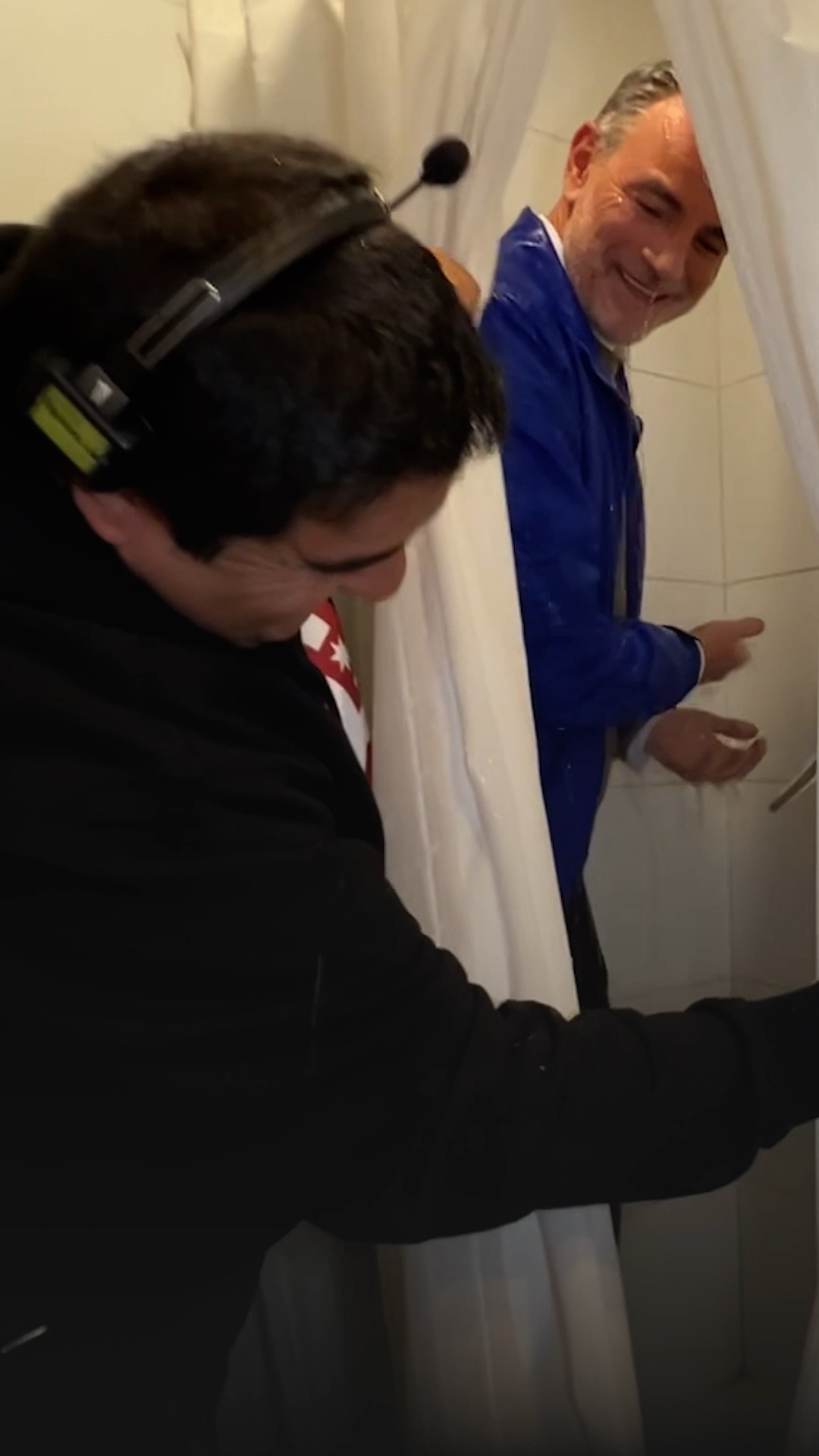 Mientras se empapaba, tuvo un gracioso dialogo con el productor, el cual sacó risas en los presentes.