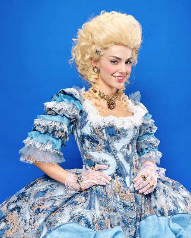 Para el rodaje de un comercial de una conocida pasta dental en septiembre pasado, cambió de estilo y época. Esta vez fue María Antonieta con su enorme peluca, pálido maquillaje y vestido que rememora el siglo XVIII.