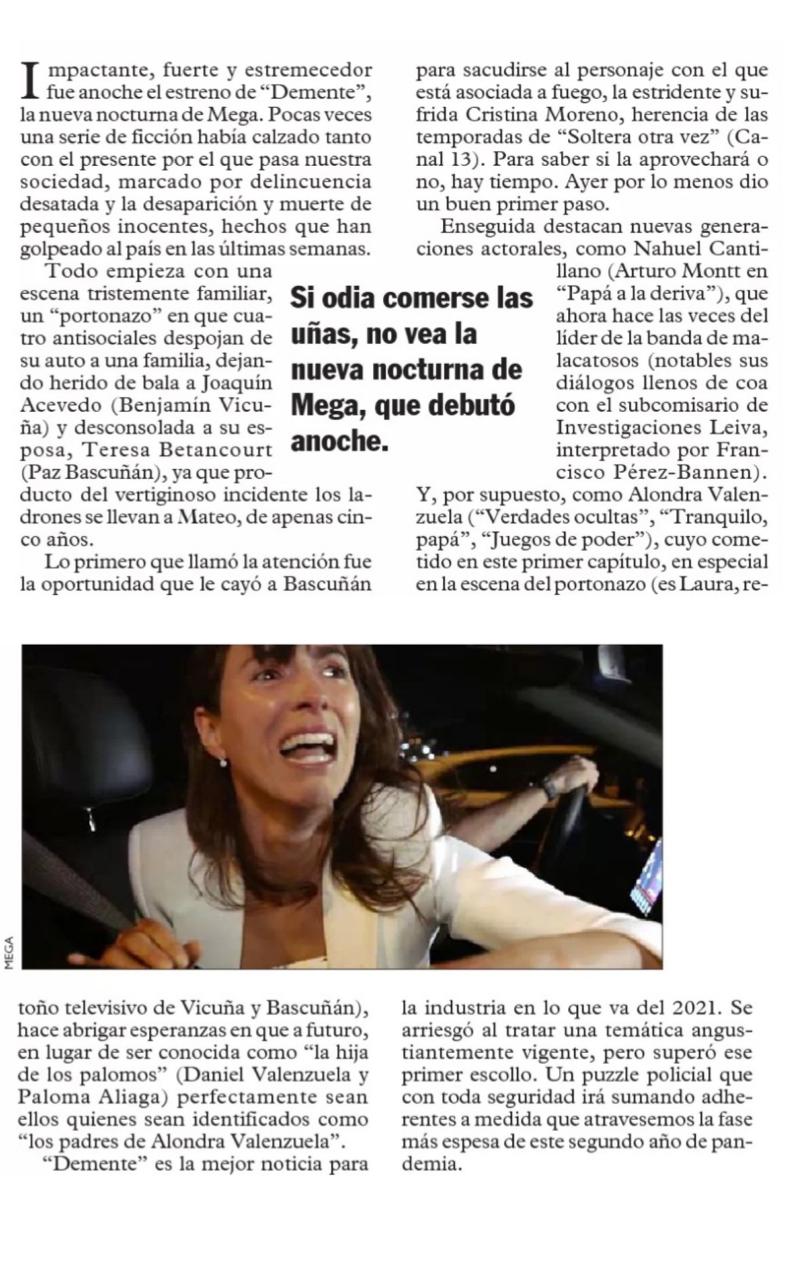 Larry Moe, comentarista de televisión del diario Las Últimas Noticias, hizo una reseña sobre lo que se verá por las pantallas de Mega, de lunes a jueves a las 22:30 horas. "Impactante, fuerte y estremecedor, fue anoche el estreno de "Demente", la nueva nocturna de Mega. Pocas veces una serie de ficción había calzado tanto con el presente por el que pasa nuestra sociedad", esbozó.