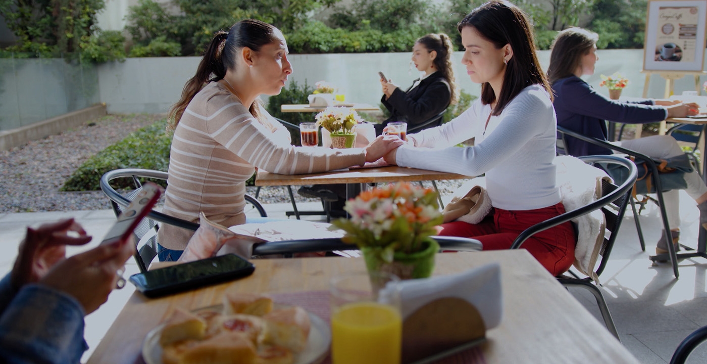 Ambas deciden pasar a sentarse a una de las mesas de la cafetería, pues la prima de Karina (Jacinta Rodríguez) tiene muchas dudas.