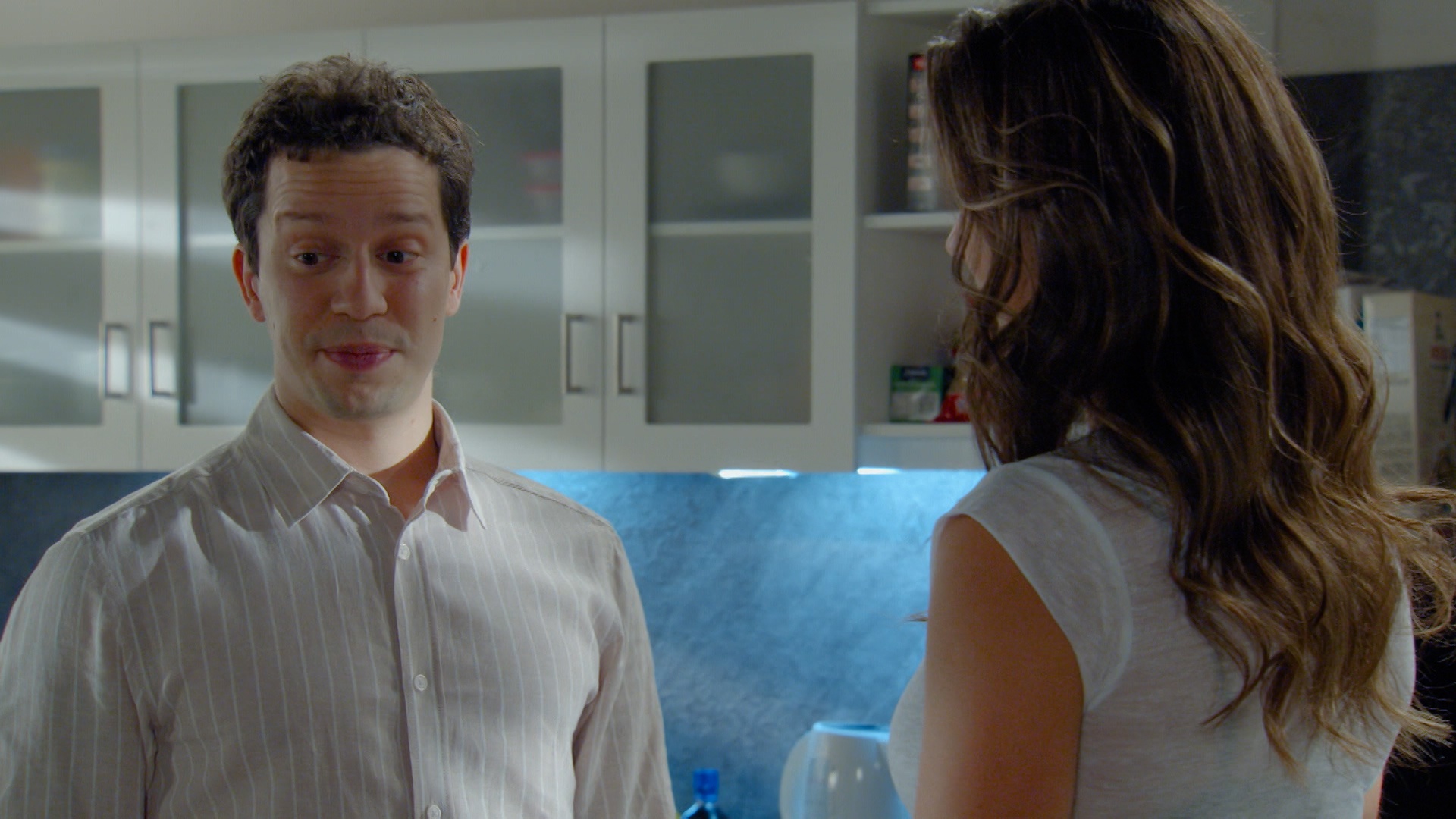 En El Jardín de Olivia, Bastián (Alonso Quintero) recibe una oferta laboral que podría cambiarlo todo. Trini (Catalina Covarrubias) le cuenta los detalles entusiasmada.