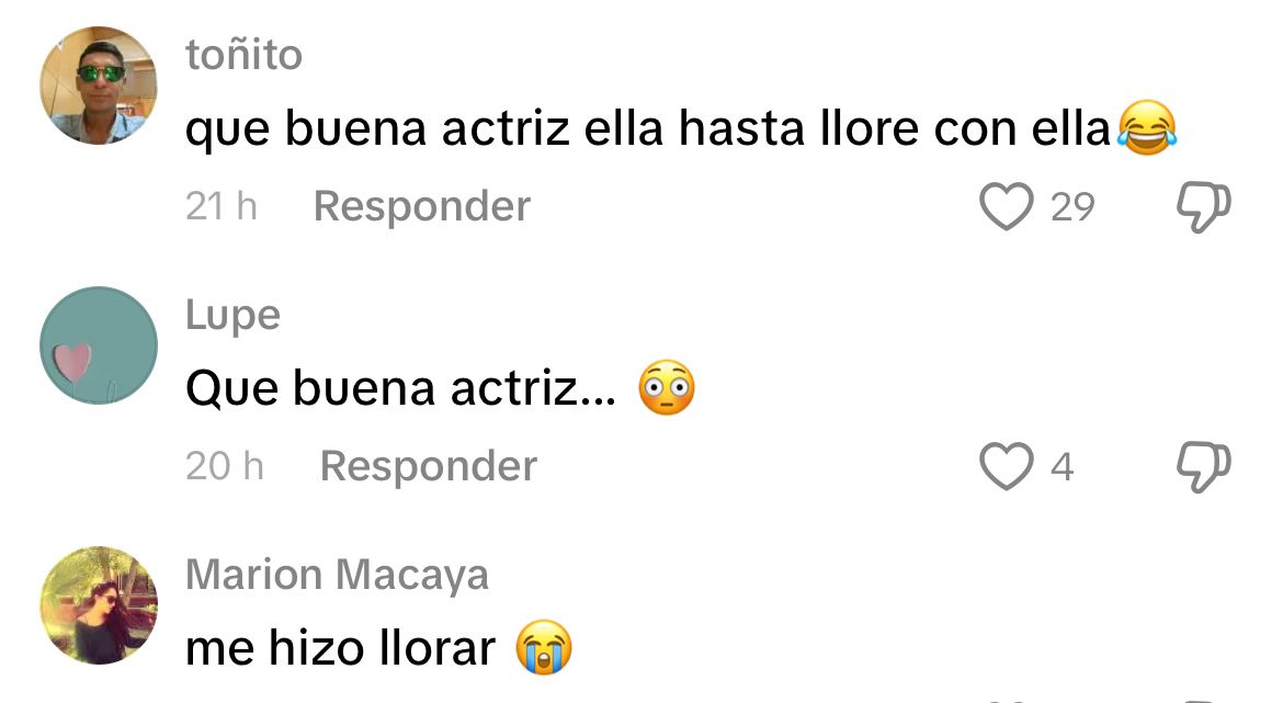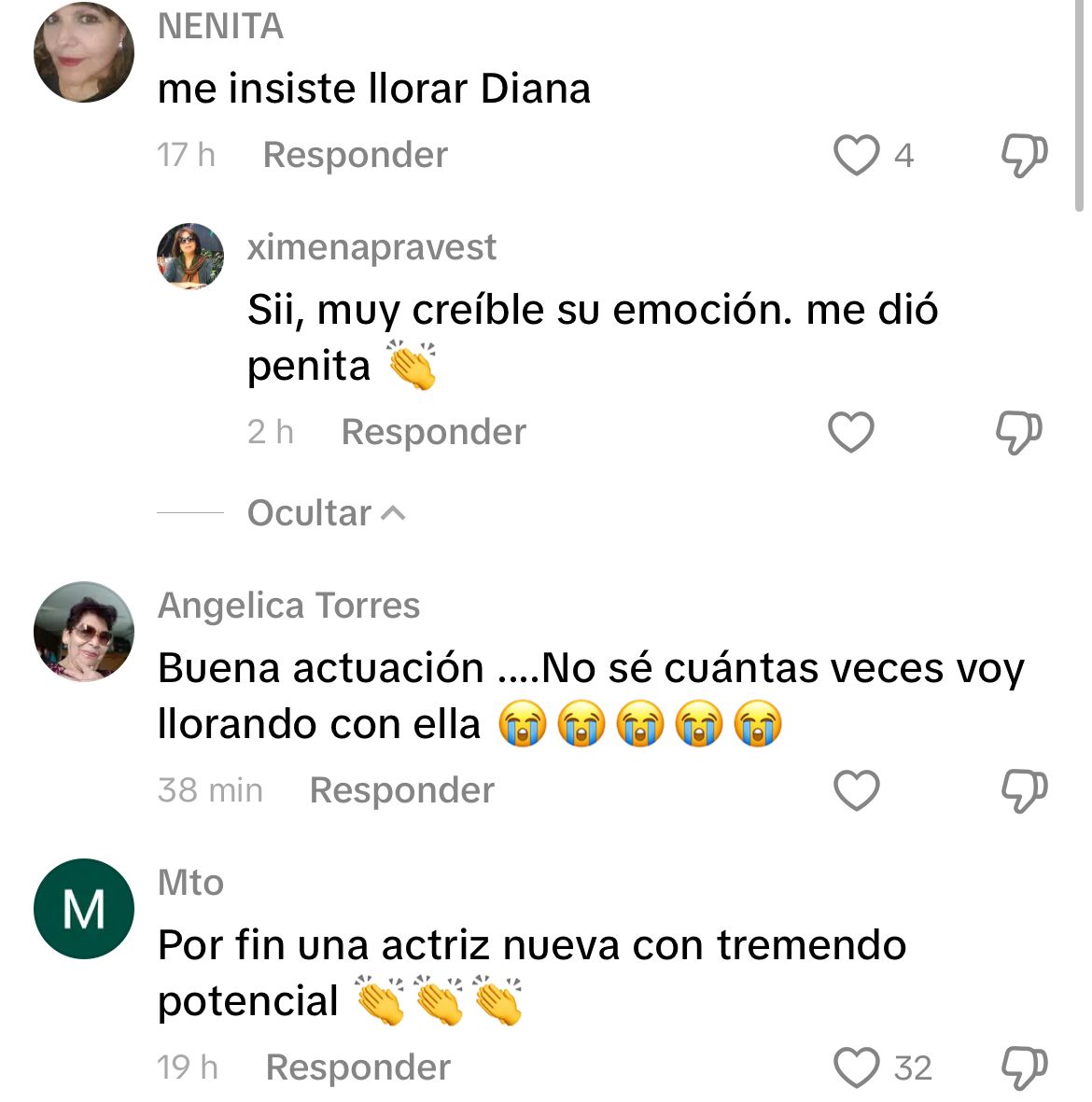 "Me hiciste llorar, Diana", "Muy creíble su emoción", "Buena actuación, no sé cuántas veces voy a llorar", "Por fin una actriz nueva con tremendo potencial"; "Qué buena actriz", fueron algunos de los comentarios de los televidentes que expresan sus elogios hacia la actriz en redes sociales.