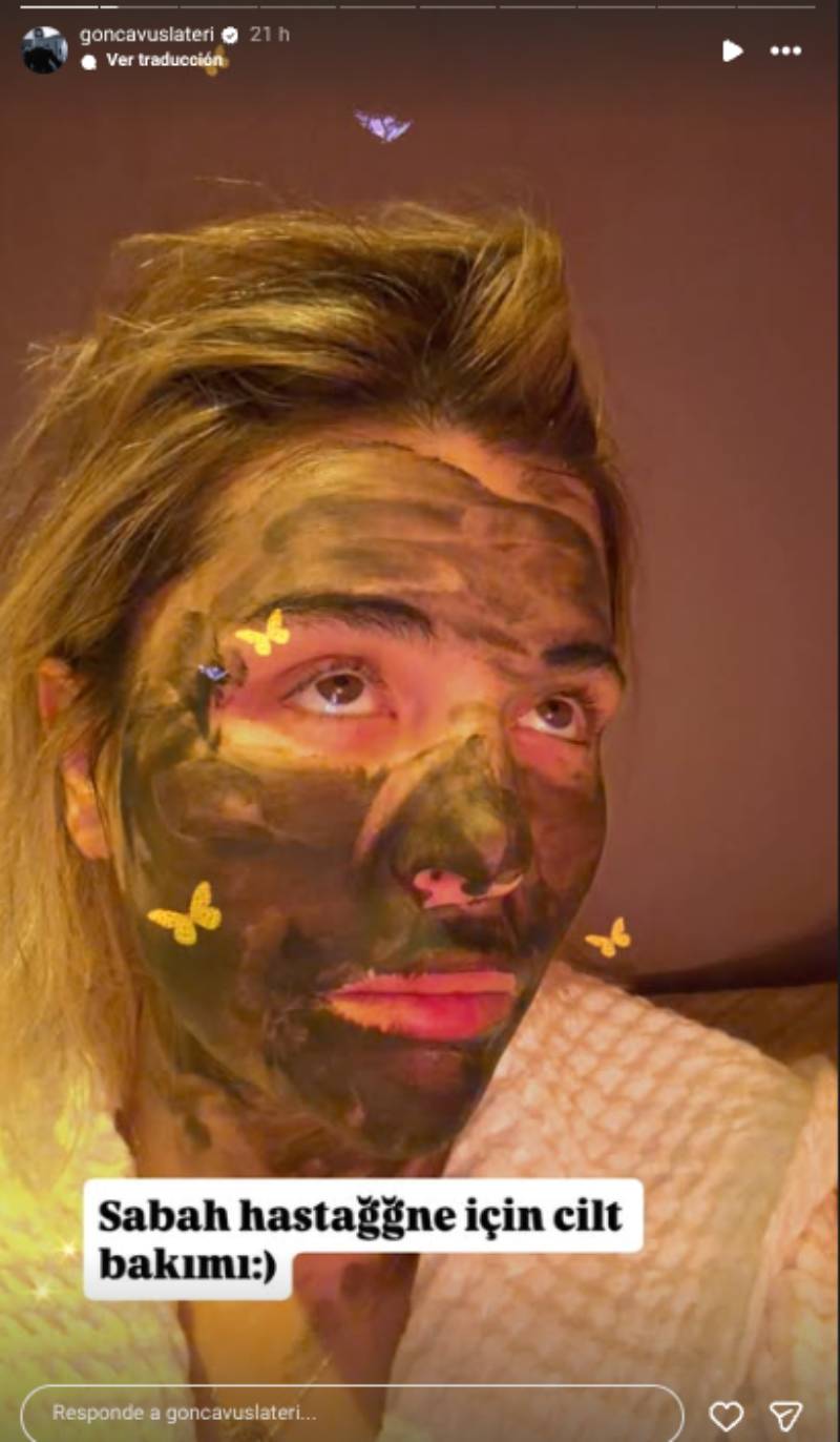 Ir a la siguiente nota"Cuidado de la piel por la mañana", escribió Gonca Vuslateri en una selfie en la que se la ve con el rostro cubierto por una mascarilla oscura, como parte de su skincare.