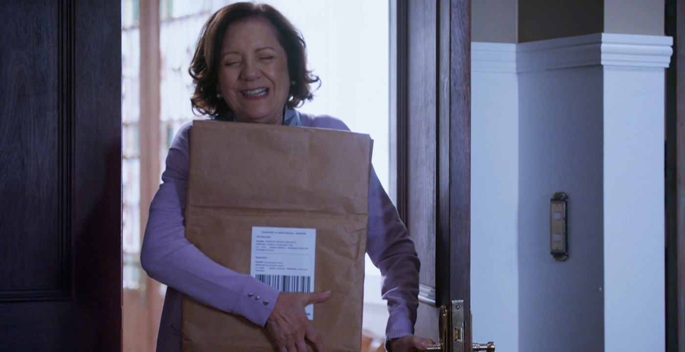 Tras lo anterior, Genoveva le entrega un paquete a Miranda que llegó a su nombre y ella queda sorprendida.