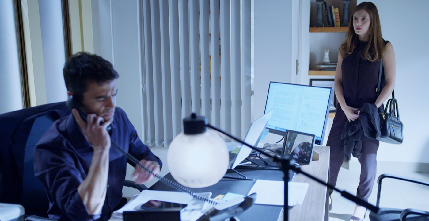 Cuando se da cuenta, el profesor de tenis retoma la calma y desvía la atención de su pareja, recordándole que tiene que asistir al funeral de la esposa de Ángel (Rodrigo Soto).