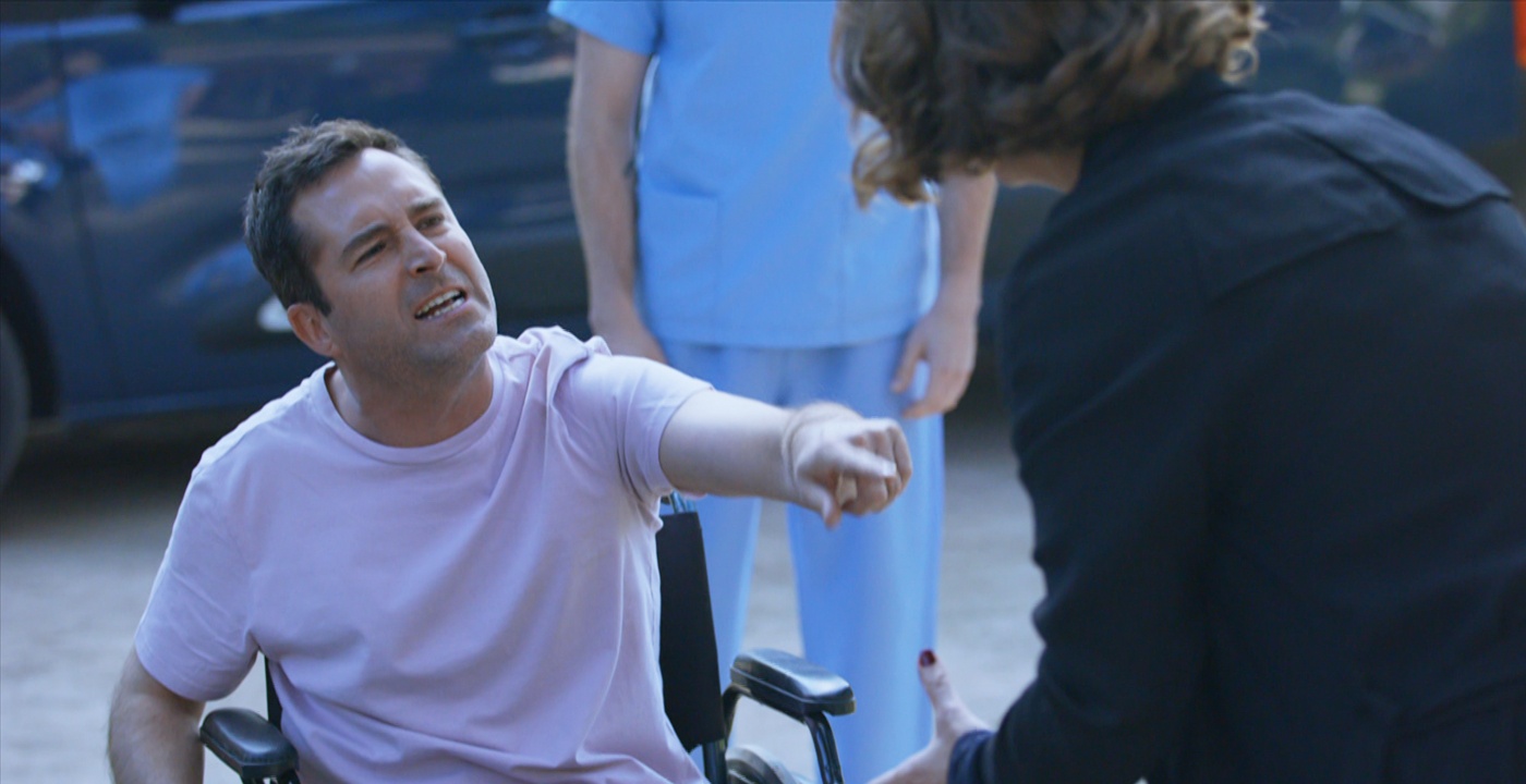 Ya en el hotel, Tomás se sube a una silla de ruedas y enfrenta a su esposa con dureza, exclamando: "¡Me mentiste, Alexandra! ¡Me mentiste! Ese picante de mier.. está en el hotel, yo ya lo sé… Te estoy hablando del muerto de hambre de Tormento".