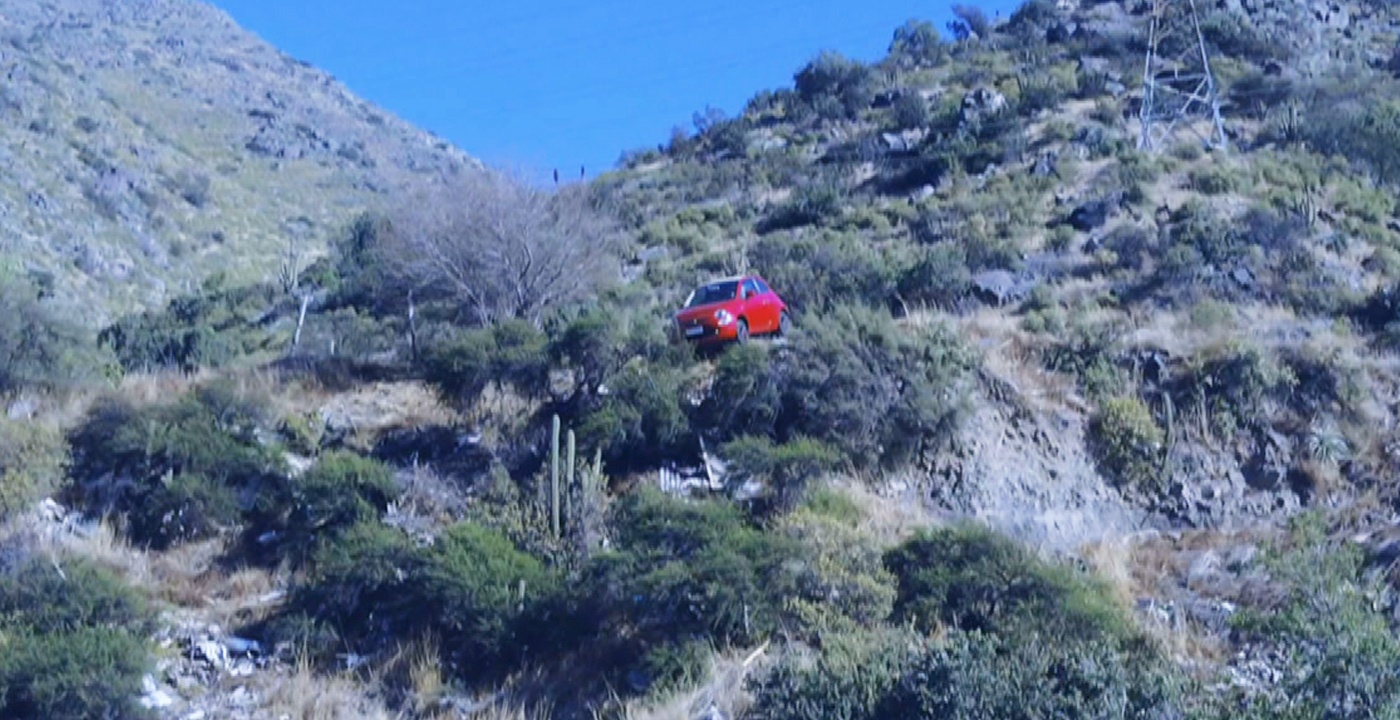 La situación provoca que el auto de la trabajadora de la Viña Ítaca quede a punto de caer, balanceándose peligrosamente a gran altura.
