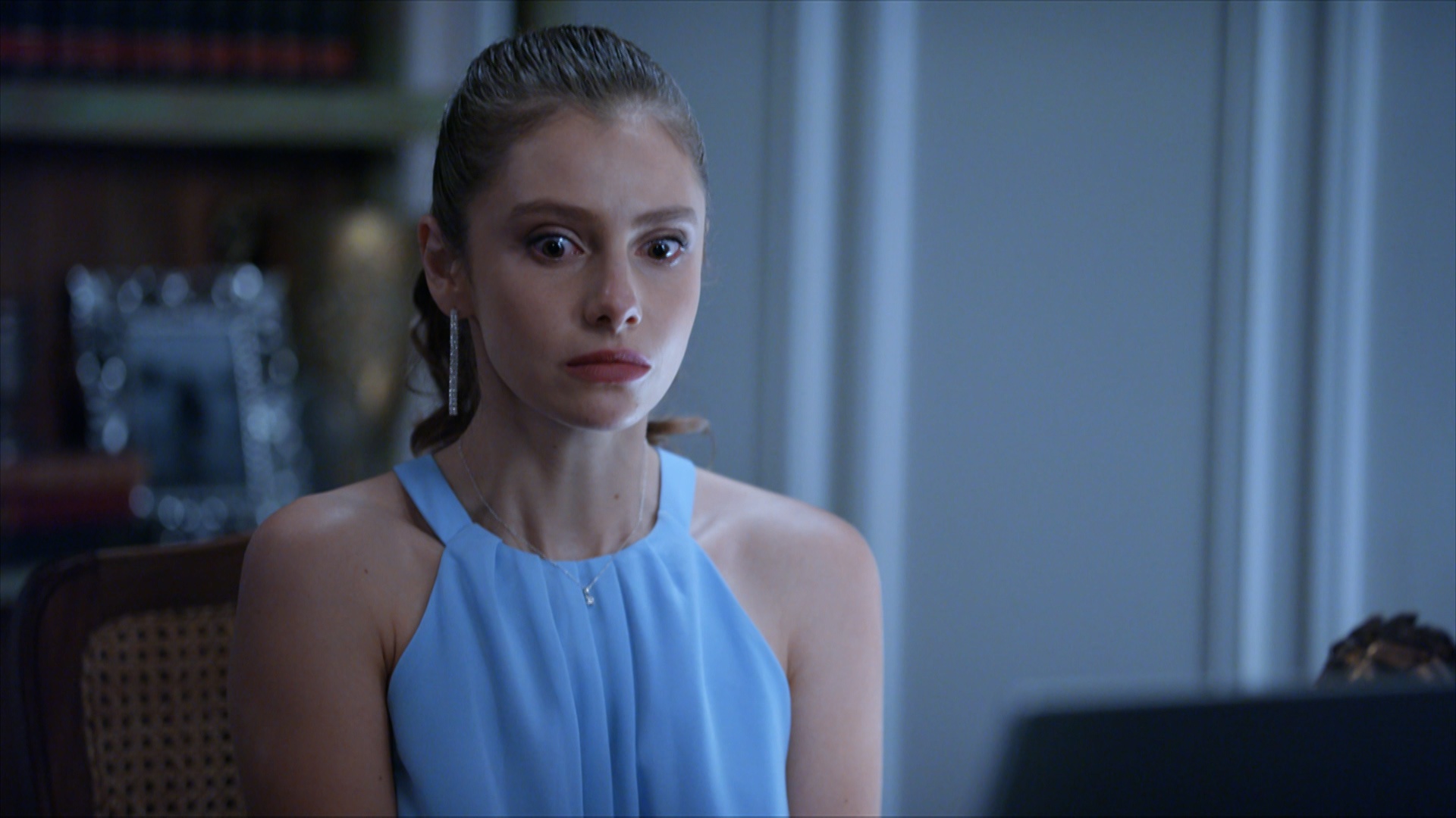 La primera reacción de Martina (Octavia Bernasconi) es negarlo y creer que es una invención de Iván (Francisco Melo) para destruirlos. Asimismo, suelta unas risas nerviosas, que podrían significar que todavía no procesa el dolor, el enojo o la traición, debido al shock emocional.