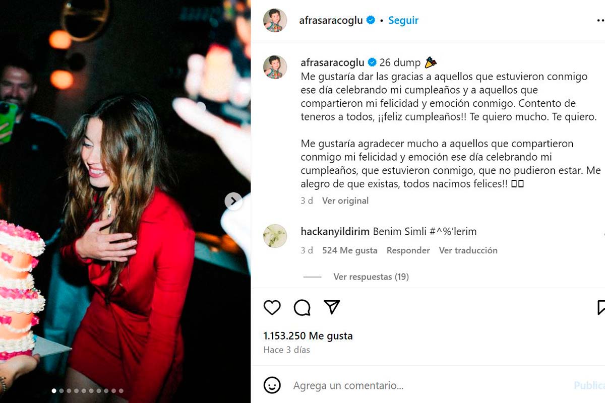 “Me gustaría agradecer mucho a aquellos que compartieron conmigo mi felicidad y emoción ese día celebrando mi cumpleaños. Los que estuvieron conmigo, y los que no pudieron estar ¡Me alegro de que existan, todos nacimos felices!”. Lo anterior lo comentó Afra en un post de su cuenta de Instagram el 8 de diciembre.