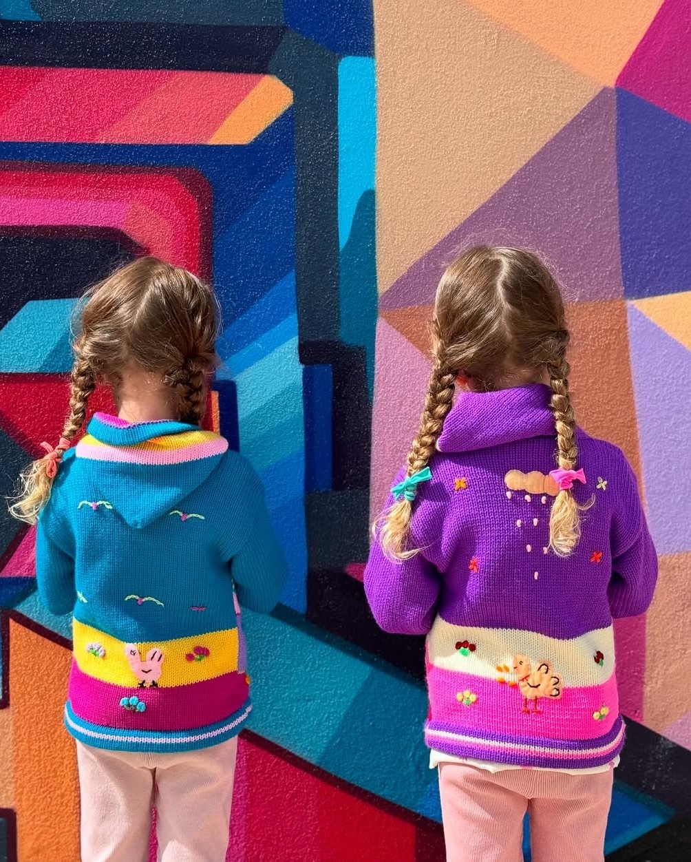 En otro post de Instagram destacan tres looks. Una propuesta ideal para el otoño son las chaquetas de punto con capucha, en tonos vibrantes, con detalles bordados, que las niñas lucieron con pantalones rosados.