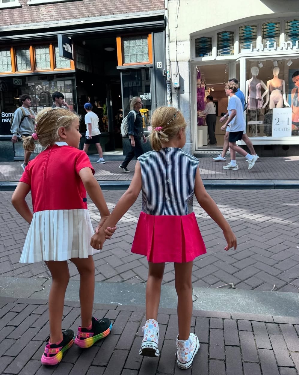 Para un paseo por la ciudad, las gemelas lucieron vestidos clásicos de niñas, de corte a la cadera con faldas plisadas. Las hijas de Pelin los hicieron más urbanos con la elección del calzado, tenis coloridos y botines de tela con dibujos de colores, los mismos que usaron con sus enteritos.