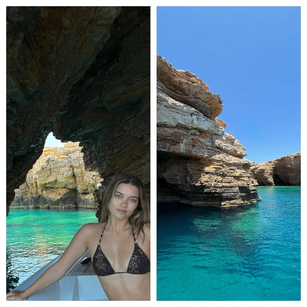 En su cuenta de Instagram, Saracoglu publicó una serie de postales de su paseo por la isla, en donde posa con un traje de baño negro en un pequeño bote, frente a unas cavernas marinas.
