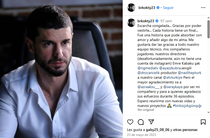El artista protagonizó Bir Küçük Gün Iisigi (nombre original de la ficción) y tuvo unas sentidas palabras al decir adiós. "Firat Ayaz, gracias por poder llevarte en mí. Cada historia tiene un final… Fue una historia que pude internalizar con amor y agregarle algo desde mi alma", señaló en Instagram con una foto del romántico empresario.